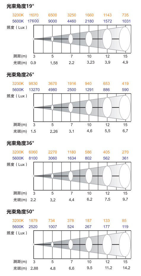 光束角度:19° 26 ° 36° or 50°