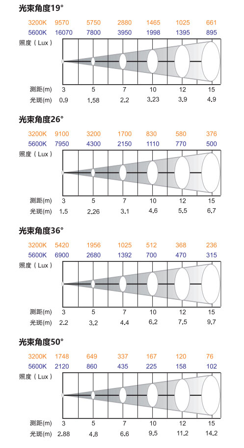 光束角度:19° 26 ° 36° or 50°