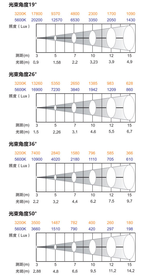 亮 度:19°≥3300LUX/10米/5600K