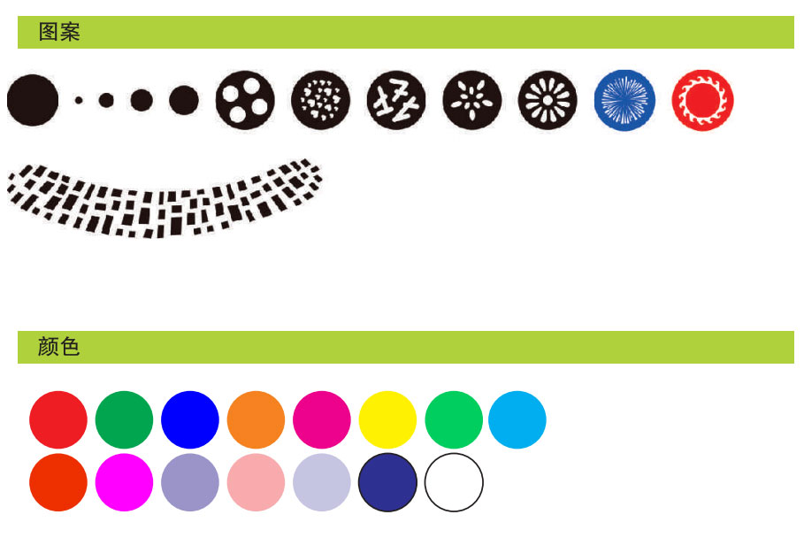圖案:一個(gè)固定圖案盤,帶12個(gè)圖案 + 白光
