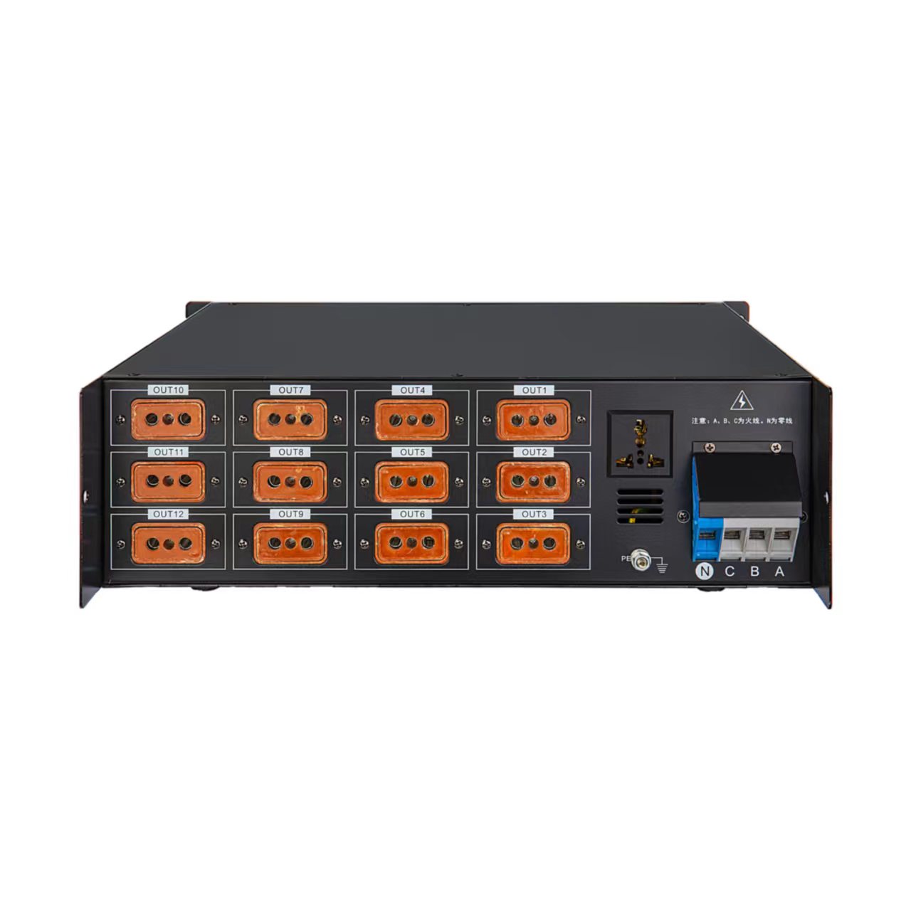 使用前請(qǐng)先接好所需要的供電設(shè)備,本產(chǎn)品可直接接入12只×4KW常規(guī)舞臺(tái)燈具或12只×4KW電腦特效燈,12路單獨(dú)控制;